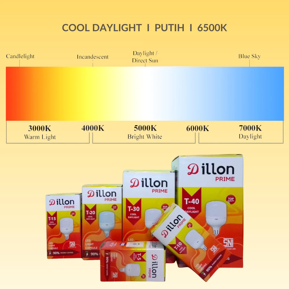 Dillon Prime dirancang untuk performa lebih stabil dengan voltase 175Vā265V dan frekuensi 50Hz. Menghasilkan cahaya 6500K Cool Daylight, lampu ini hemat energi, tahan lama hingga 15.000 jam, dan menggunakan dudukan universal E27. Cocok untuk penggunaan rumah maupun area kerja yang membutuhkan cahaya cerah dan merata.