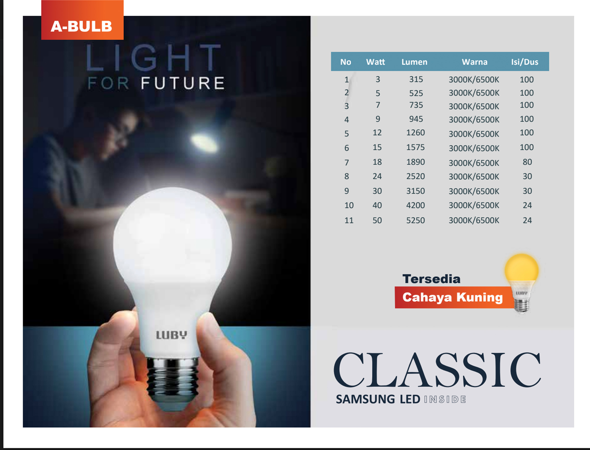 Lampu Luby Classic A-Bulb menghadirkan pilihan suhu warna 3000K (warm white) dan 6500K (cool daylight), membuatnya fleksibel untuk berbagai suasana ruangan. Dengan CRI > 85, warna yang dihasilkan tampak lebih akurat. Daya tahan 15.000 jam dan voltase 100Vā240V menjadikannya lampu universal dan tahan lama.